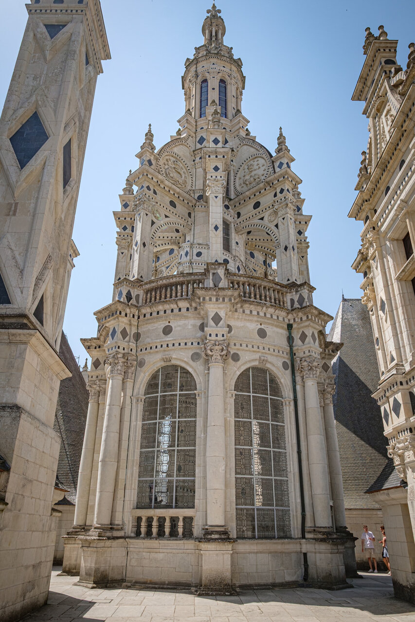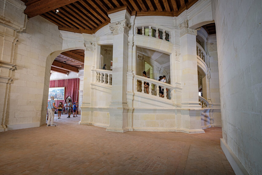 Mit dem Bau wurde 1519, dem Todesjahr da Vincis begonnen, und 1539, als der König dort Kaiser Karl V. empfing, war er immer noch nicht abgeschlossen. Der quadratische Kernbau mit vier Ecktürmen, der sogenannte Donjon, war um 1540 vollendet. Entsprechend der Bauaufgabe, quasi als großes Jagdlager für eine ganze Anzahl hochstehender Gäste fast gleichen Ranges, bot Schloss Chambord eine größere Anzahl ähnlich großer und ähnlich ausgestatteter herrschaftlicher Wohnappartements ohne architektonische Hervorhebung einer besonderen Wohnung für den königlichen Hausherrn.