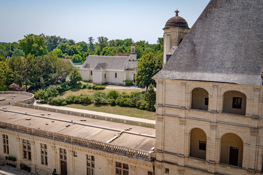 Das auffälligste Merkmal des Schlosses ist die ungewöhnlich reiche Dachlandschaft, die in dieser Form nahezu einzigartig ist. Besonders hier finden sich asymmetrisch angeordnete Kamine, Fenster und Türmchen in den beiden Schlossflügeln. Auch die großen Rundtürme weisen starke Asymmetrien in der Anordnung der Fenster auf, die sich bis zum Erdgeschoss hinziehen, was in diesem Ausmaß in der Architektur der Renaissance nicht auftritt. Der kreuzförmige Grundriss des Corps de Logis wird über den Eckappartements von vier steilen Pyramidendächern überragt, die direkt in die kegelförmigen Dächer der Ecktürme übergehen. Wo sich in den darunter liegenden Stockwerken die kreuzförmigen Korridore befinden, ist das Dach als Terrasse begehbar ausgeführt, so dass die Aufbauten, die aus diversen Lukarnen, Schornsteinen und Laternen bestehen, den Eindruck einer Stadtlandschaft vermitteln. Der Schriftsteller Chateaubriand verglich den Kontrast der ebenmäßigen Fassaden und des überbordenden Dachaufbaus mit einer Frau mit vom Wind zerzausten Haaren. Die Schieferbedachungen und die Menge von Fialen im Flamboyantstil der Spätgotik bilden einen Kontrast zum symmetrischen Aufbau des Anwesens im Stil der Renaissance.