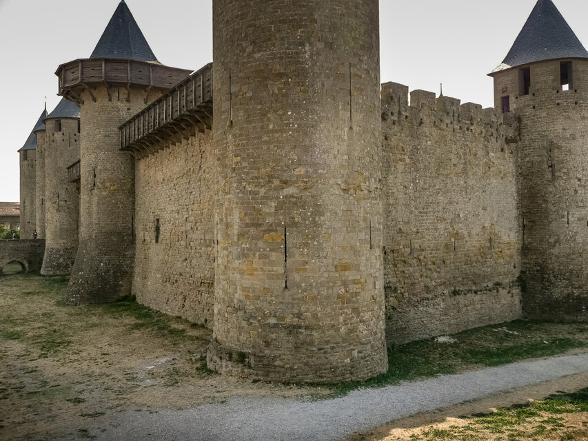 Die Mauern der Cité stammen aus mehreren Bauperioden. Die ältesten Mauerteile wurden zur Zeit der Westgoten errichtet. Sie sind zu erkennen an den Schichten kleiner, würfelförmiger Steine, unterbrochen von Ziegelschichten – und an der Enge der Türme, die aber schon mit richtigen Fenstern versehen sind. Im 12. Jahrhundert wurde vor allem die Burg errichtet. Aus der Mitte des 13. Jahrhunderts stammt der äußere Mauerring mit seinen glatten Quadern.
