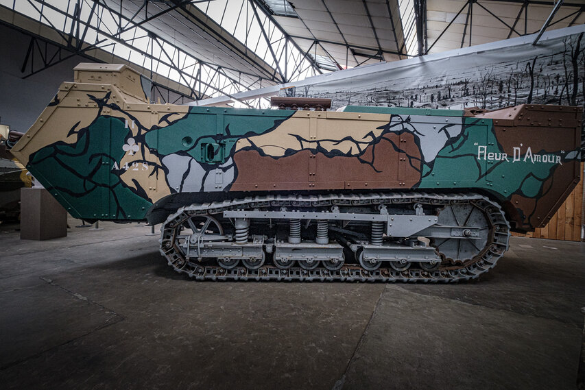 Première salle du musée suivant l'espace Accueil, elle est consacrée aux premiers blindés français et canons français apparus lors de la Première Guerre mondiale. On y trouve un modèle de char Saint-Chamond (dernier exemplaire existant), un char Renault FT (canon), un char Renault FT (mitrailleuse), un char FT TSF (Transmission Sans Fil), un char Schneider CA1 (dernier exemplaire existant) ainsi qu'un camion Renault. Pour l'artillerie, il y a deux canons de campagne de 75 mm (équipant les chars Saint-Chamond), dont un écorché, un canon de 37 mm SA 18 (monté sur les chars léger français), un mortier 75 BS Schneider et un canon de 37 mm de marine.