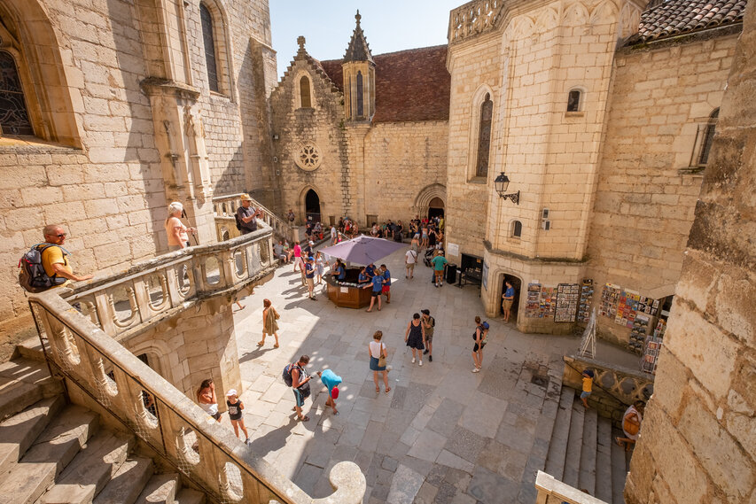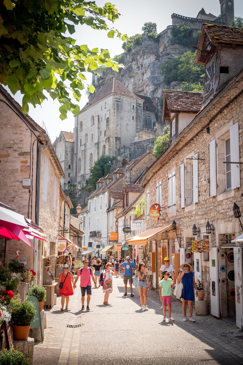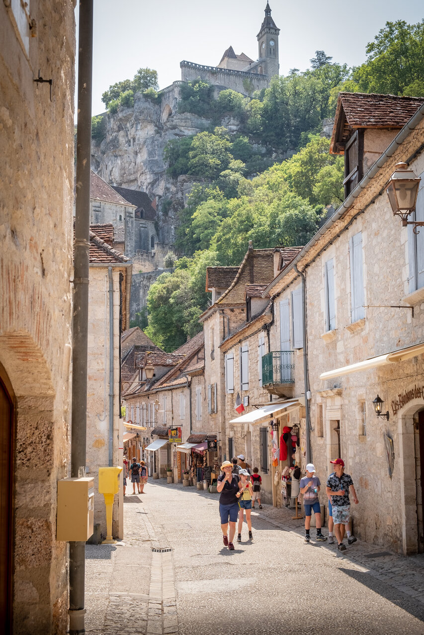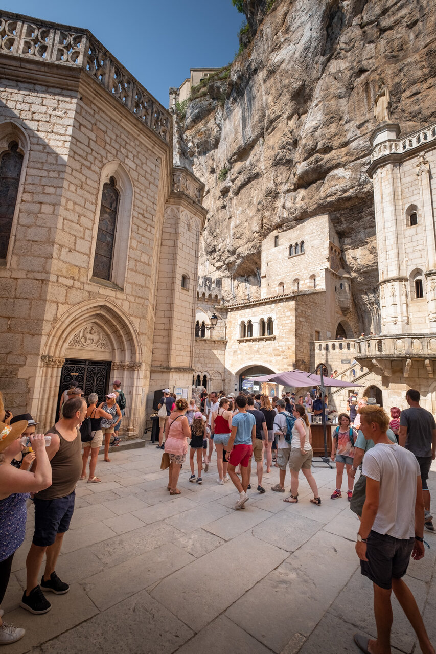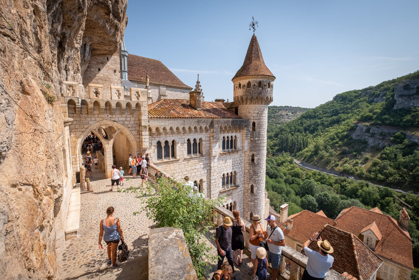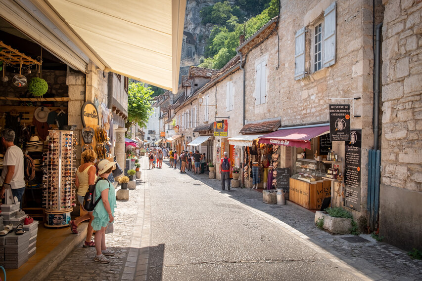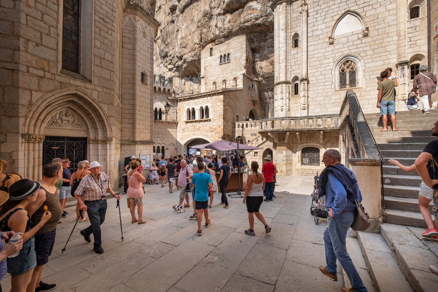 Die drei Ebenen, auf denen Rocamadour liegt, sind jede für sich und in ihrer Gesamtheit sehenswert. In der unteren Ebene befindet sich das Dorf, dessen mittelalterliche Häuser sich an die steilen Abhänge über der Schlucht des Flusses Alzou schmiegen. Von dort können die Besucher die Große Treppe zur heiligen Stadt (Sanctuaire) aus dem 12. Jahrhundert hinaufsteigen.