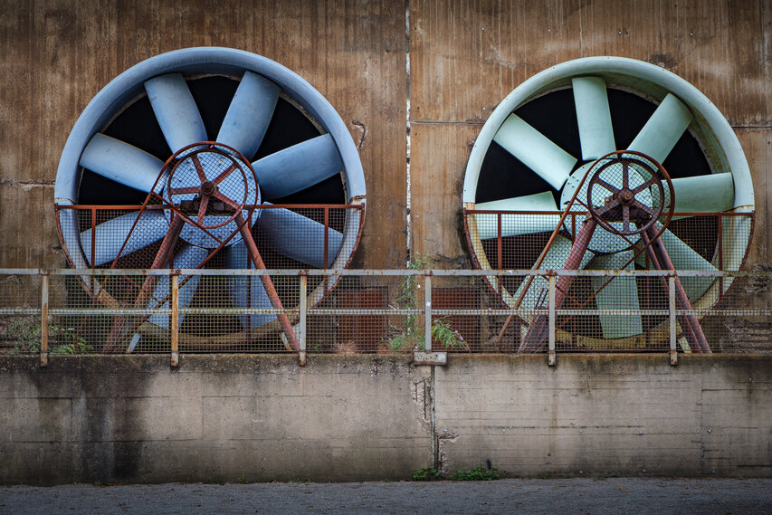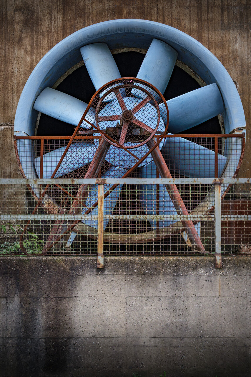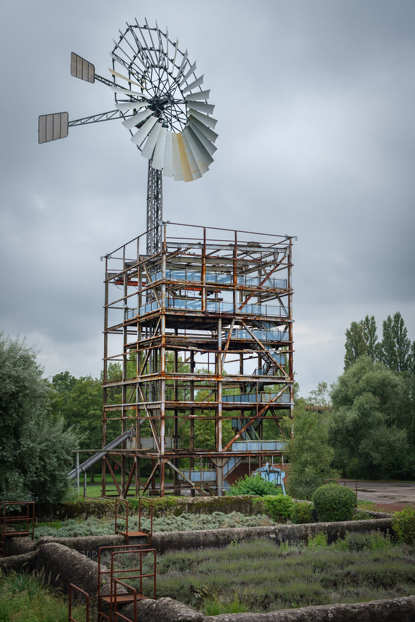 - Eine weitere Landmarke des Landschaftsparks – neben den drei Schloten – ist das Windrad, das auch noch aus großer Entfernung zu sehen ist. Es ist über ein Getriebe mit einer Wasserpumpe verbunden und fördert über eine Schnecke das Wasser der Alten Emscher für die Bunkergärten. Durch die Sauerstoffanreicherung wird gleichzeitig die biologische Qualität des Wasserlaufs verbessert.