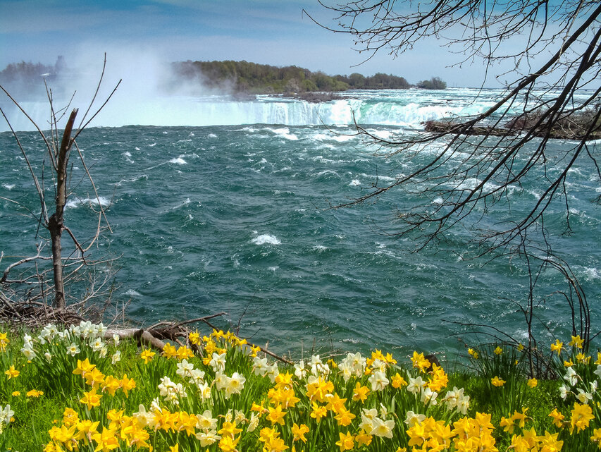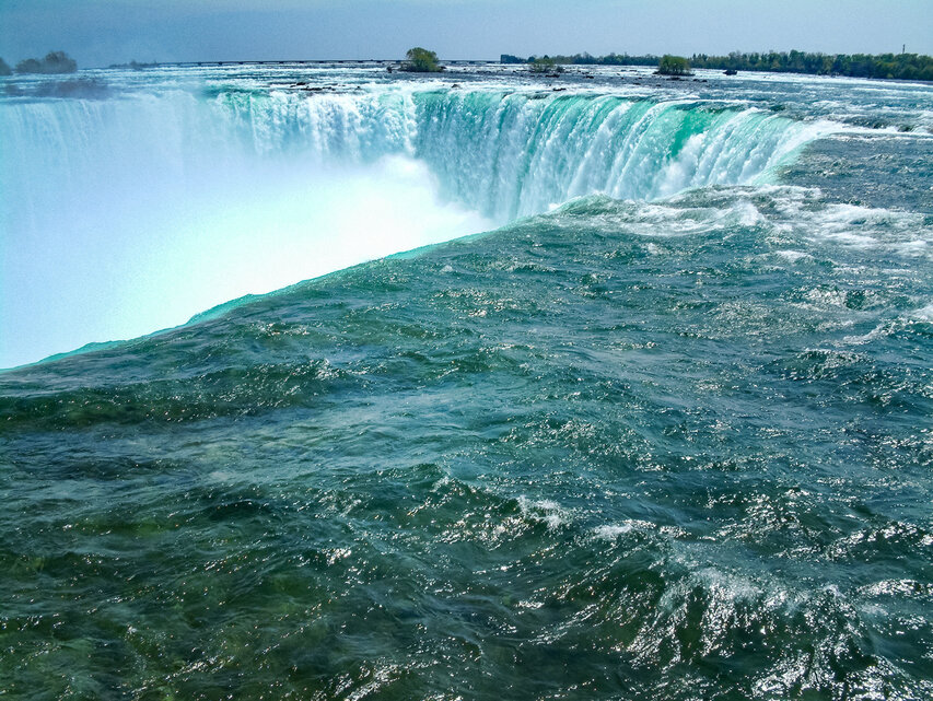 Der Niagara River verbindet den Eriesee mit dem Ontariosee. An den Niagarafällen stürzt er 57 Meter in die Tiefe. Die oben gelegenen Inseln Luna Island und Goat Island (Ziegeninsel) spalten die Fälle in drei Teile: Die American Falls und die kleineren Bridal Veil Falls, die beide ausschließlich auf US-amerikanischem Gebiet liegen und die Horseshoe Falls, durch die die Grenze zwischen den USA und Kanada verläuft. Die American Falls haben eine Kantenlänge von 260 m, die Horseshoe Falls eine von 670 m. Das Wasser der American Falls fällt über eine Kante von 21 bis 34 m Höhe auf eine Sturzhalde, die bei einem Felssturz 1954 entstand. Die Horseshoe Falls haben eine freie Fallhöhe von 57 m. Schiffe umfahren die Fälle durch den zwölf Kilometer westlich liegenden, 43,4 km langen Wellandkanal.