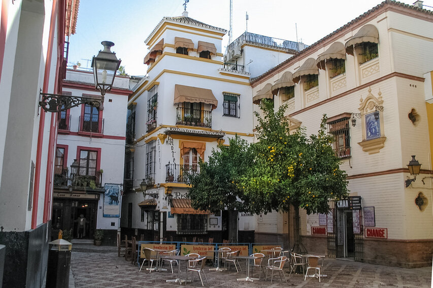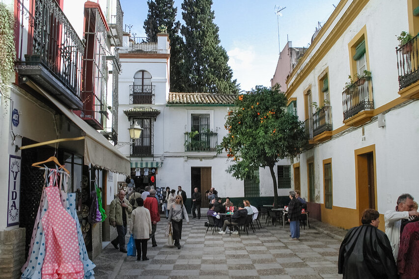 Die Altstadt wird von engen Gassen dominiert. Besonders malerisch ist das Stadtviertel Santa Cruz. Zu den größeren, regelmäßigen Plätzen gehören die Plaza de San Francisco (Konstitutionsplatz) mit Prachtbauten, die Plaza del Duque mit Promenade, die Plaza de la Encarnación, der Museumsplatz mit Bronzestatue Murillos und der Quemadero, wo die Autodafés stattfanden. Die belebteste Straße ist die schlangenartig gewundene Calle de Sierpes. Unter den Häusern sind zahlreiche palastartige, meist im altrömischen Stil erbaute, mit marmorgetäfelten Höfen; im übrigen herrschen in der Altstadt orientalische Formen vor. Die Gebäude weisen fast durchgängig Flachdächer auf und sind dabei selten höher als zwei Stockwerke. Die Vorstadt Triana ist seit 1852 durch die Puente de Isabel II mit der eigentlichen Stadt verbunden. Sevilla hat zahlreiche öffentliche Brunnen, die vorwiegend durch den aus 410 Bögen bestehenden antiken Aquädukt Caños de Carmona mit Wasser versorgt werden. Zu den mehr als 130 Kirchen zählt die Kathedrale. Unweit von dieser befindet sich das Museo del Baile Flamenco, das einzige Flamencomuseum der Welt, initiiert von Cristina Hoyos Panadero.