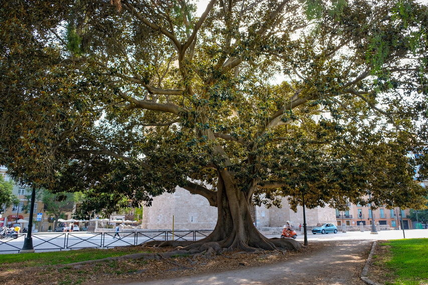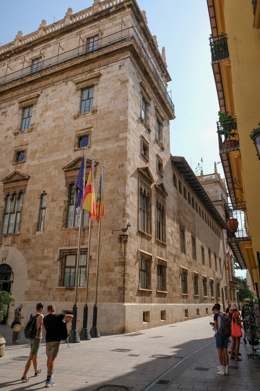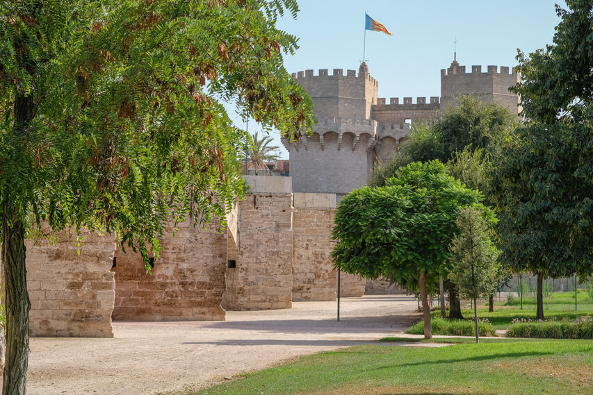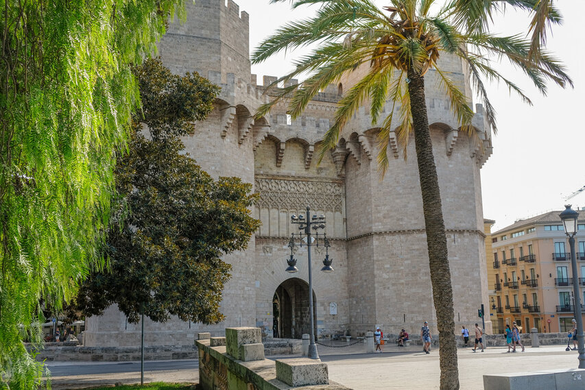 Das frühere Stadttor Torres de Serranos stellt das bekannteste Wahrzeichen von Valencia dar. Es bildete den Zugang zur Stadt von Nordwesten her, also auf den Landstraßen von Barcelona und von Zaragoza und war in die heute nicht mehr vorhandene Stadtmauer eingefügt. Unmittelbar vor dem Tor war der Fluss Turia auf einer rund 100 Meter langen Brücke zu überqueren. Der Bau wurde in den Jahren 1392 bis 1398 errichtet. Die Türme sind gut 30 Meter hoch. Die rückwärtige Mauer wurde im 19. Jahrhundert entfernt, so dass der Bau jetzt von hinten offen ist. Zeitweilig diente er als Gefängnis. Das Tor ist neben den ähnlich imposanten „Torres de Quart“ das einzige verbliebene Stadttor.