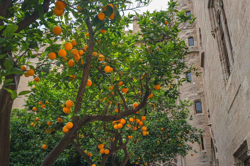 In der Umgebung Valencias werden die Straßen von Orangenfeldern gesäumt. Valencia war und ist immer noch ein Zentrum für Zitrusfrüchte.